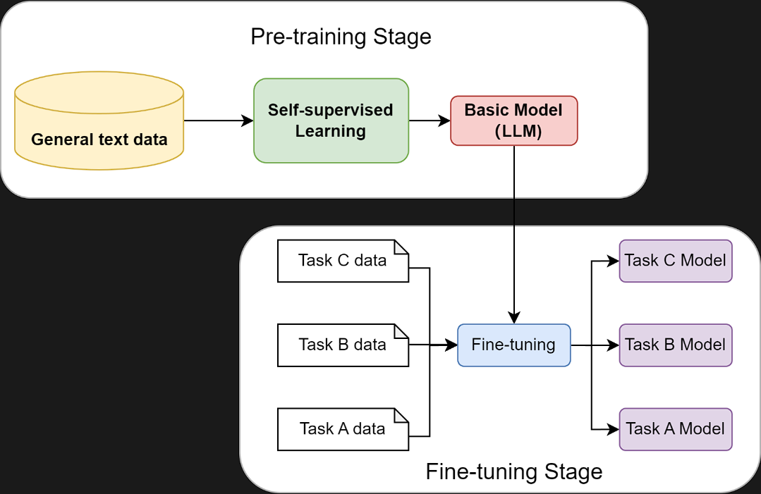 在进行强化学习等特化目标的训练前,先用自然语言处理+监督自学习,把大量的网络文本进行输入训练出一个基础的通用模型LLM,它的目的是有一些基础常识,比如“预测下一个词”。