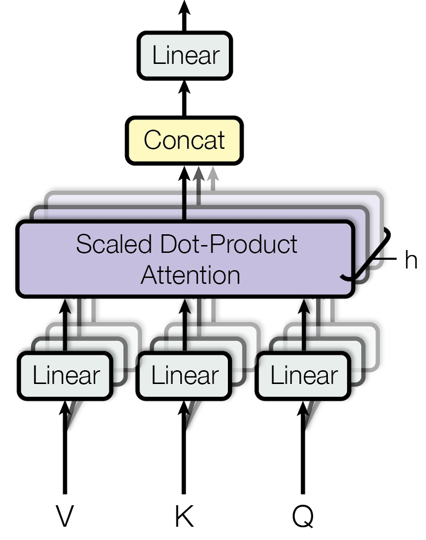 它将原始的 Q, K, V 向量在维度上切分成 h 份(h 就是“头”数),每一份都独立地进行一次单头注意力的计算。这就好比让 h 个不同的“专家”从不同的角度去审视句子,每个专家都能捕捉到一种不同的特征关系。最后,将这 h 个专家的“意见”(即输出向量)拼接起来,再通过一个线性变换进行整合,就得到了最终的输出。